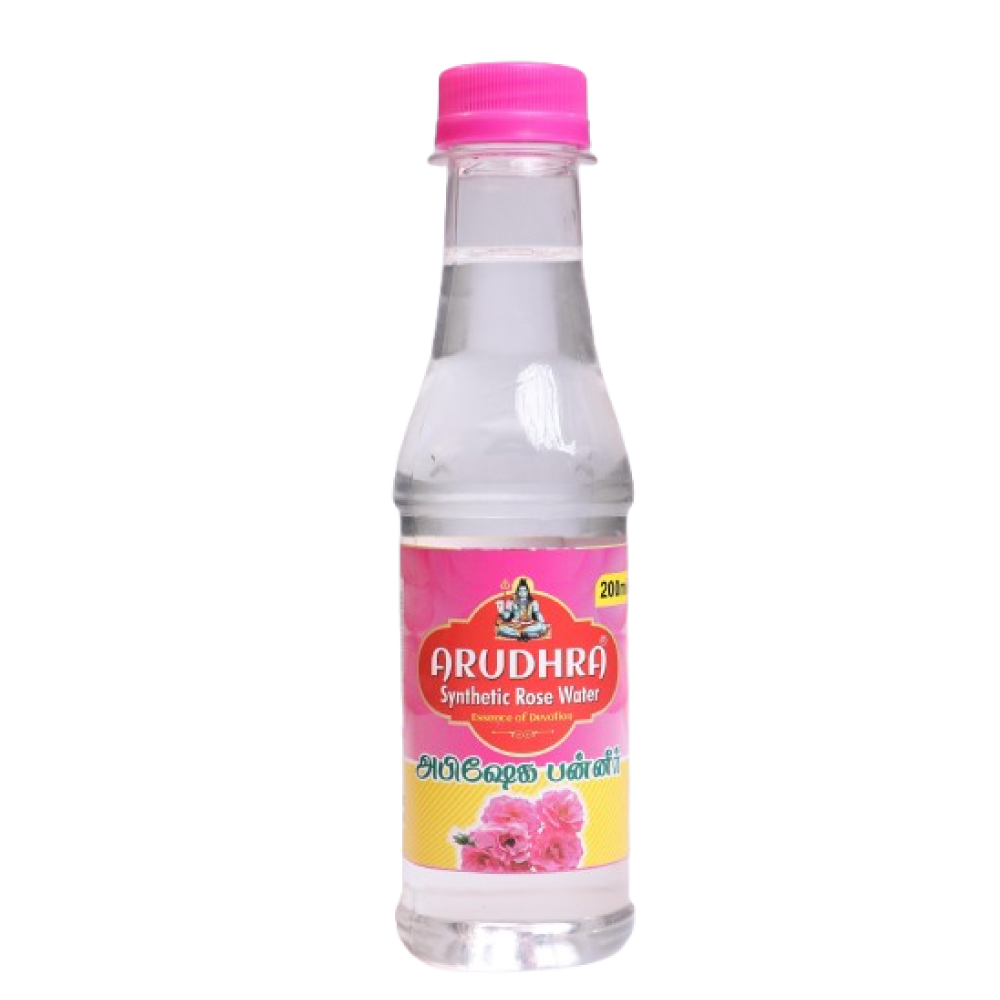 A compact 200 ml bottle filled with pure, refreshing rose water suitable for face misting, pooja, and quick daily use.